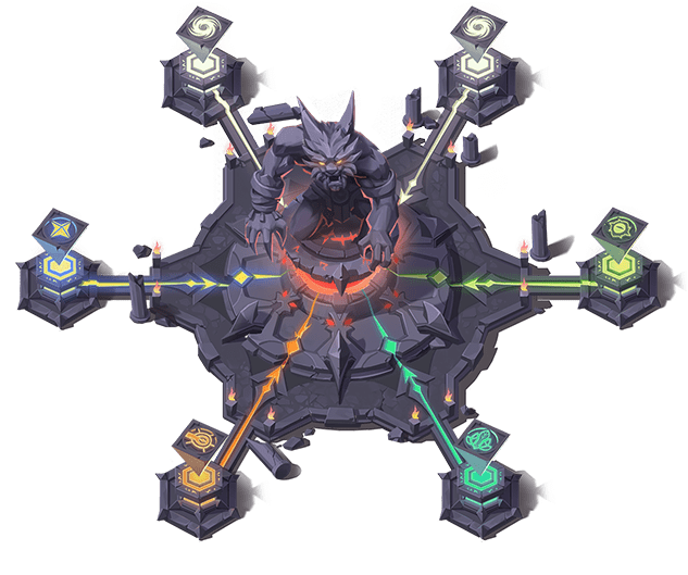 Adrax enjoys buffs by illuminating the 6 different beacons which surround him on his cell. 5 of these beacons correspond to a specific faction to boost the damage dealt against that faction, and the 6th beacon mitigates the damage Adrax receives from hero attacks. The first time Adrax's health falls below 80%, he receives power from his beacons, restoring his health to 80%.