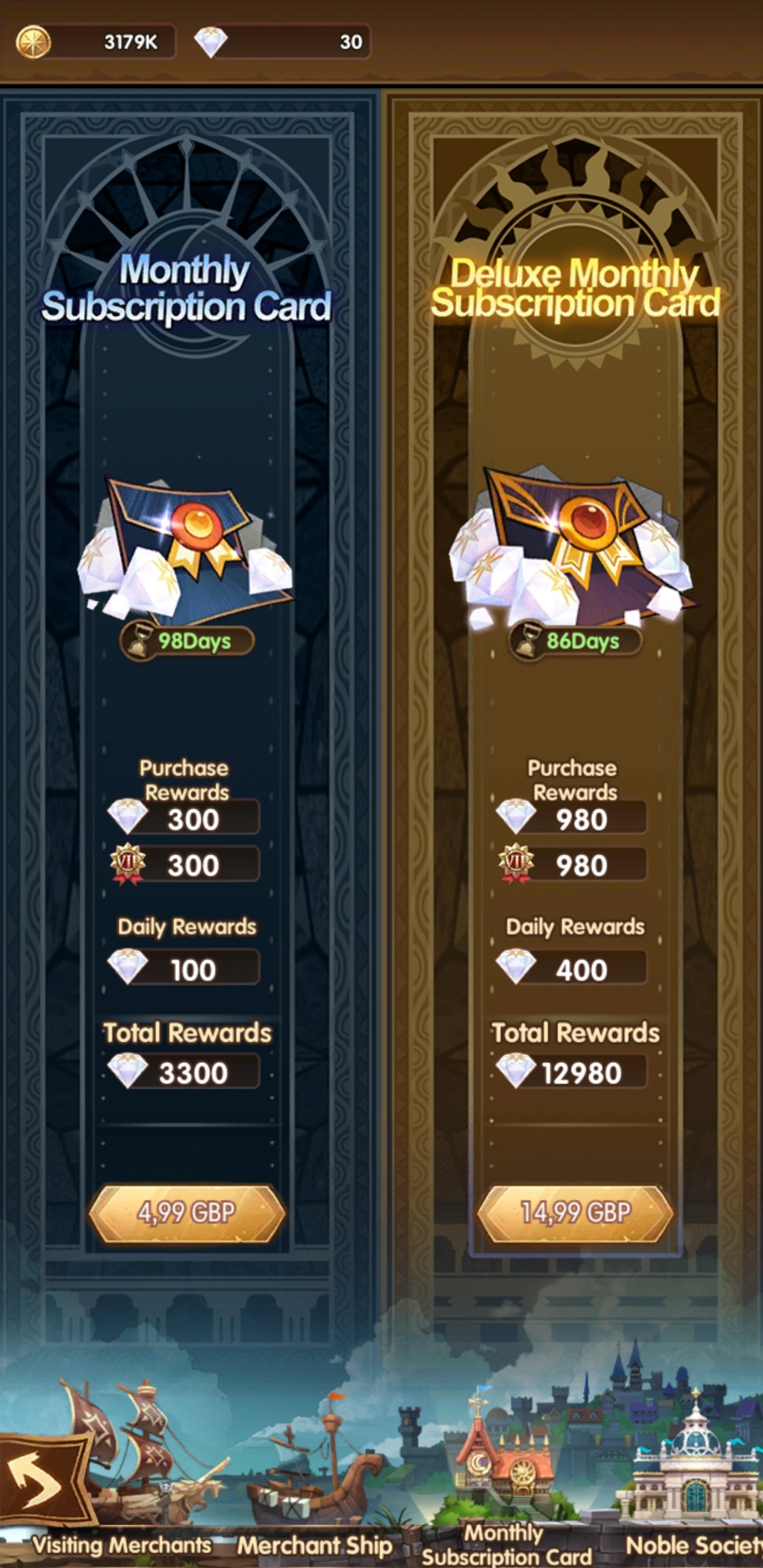 - Monthly Subscriptions Card where you can find 2 types of monthly subscriptions, both granting Diamonds daily (100 Diamonds with Monthly Subscription Card and 400 Diamonds with Deluxe Monthly Subscription Card). You can have active both types of subscription simultaneously and when you buy a subscription when it is active, its duration increases accordingly. Both subscrip=tions have good value per money spent.